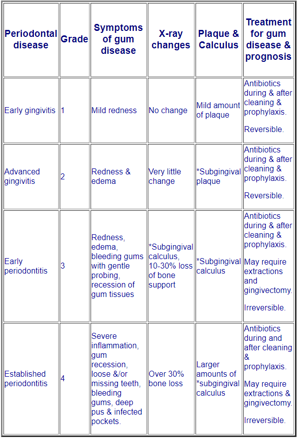 For ease of understanding where your dog's current dental diagnosis fits, we have prepared the following chart as a general guide to periodontal grades.